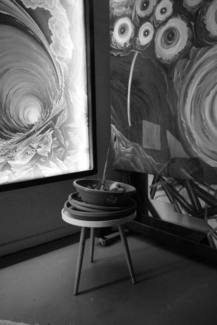 Las caras de los cuadros ((telas) \ (lienzos)) interiores al hexágono, están pintadas con óleo. En ellas hay paisajes de nubes y rocas (piedras). Las piedras representan la percepción humana de la energía que vibra lentamente, lo que tiende a ser sólido (tangible). Las nubes representan la percepción humana de la energía que vibra rápidamente, lo que tiende a ser ((etéreo)\(efímero)). En el reverso (cara externa de los cuadros del hexágono) se pueden ver la madera del bastidor y además textos y diagramas escritos a mano alzada. Estos textos y diagramas describen los procesos, las preguntas y los bosquejos que culminaron en la creación de la pintura que se encuentra en la cara interna. Estos cuadros exploran diferentes posibles soluciones energéticas a los dilemas de la experiencia humana frente a dilemas y circunstancias históricas, de nuestro presente y de las ficciones que creamos. Dichas soluciones energéticas son “acciones”. En las pinturas se pueden apreciar ocasionalmente figuraciones que parecen “puertas, túneles y/o ventanas” representadas con los mismos colores que las rocas. Estas puertas buscan representar (representan) el concepto de tecnología como catalizador espacial y energético de las acciones humanas. En los cuadros se busca presentar oportunidades para indagar sobre preguntas como:
